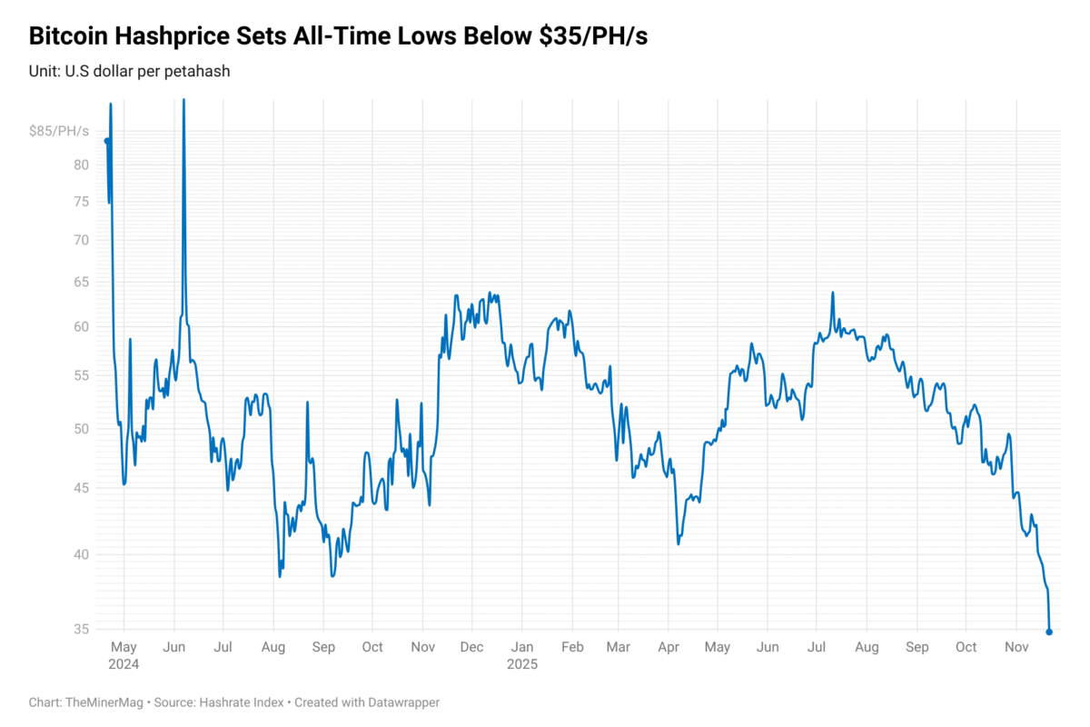 Bitcoin Hashprice Sinks to 14-Month Low Below $40/PH/s as BTC Falls to $95K November 17, 2025November 17, 2025